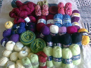 Heittelin pikaisesti sängyn päälle kasaan 21 työhön varatut langat. Kyllähän näistä varasto mukavasti keventyisi! Ainakaan uutta lankaa en saa ostaa ennen elokuuta! Pyhä tarkoitukseni olisi tehdä kaikki KYJYt varastossa olevista langoista.