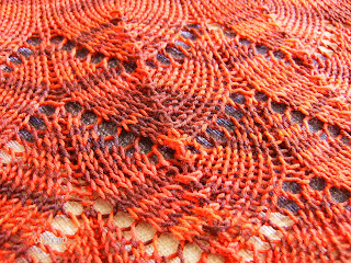 Tarkoitukseni oli alunperin seurata langankulutusta. Olin jo ennalta tutkinut Ravelrysta muiden projekteja ja niiden langankulutusta, joten jonkinlainen aavistus langan riittävyydestä oli jo. Mutta eihän minulla ollut vaakaa reissun päällä mukana, ei edes mökillä. Sileää osuutta tein 201 silmukkaan asti. Toistin A-kaaviota neljä kertaa ja B-kaavion (reunakaavio) puolivälissä totesin ettei lanka sittenkään riittäisi ihan loppuun asti. Koska varastostani ei tällä hetkellä löydy tähän väritykseen edes jotenkin sopivaa korviketta, oli pakko improvisoida muutama kerros riviltä 9 eteenpäin. Päättelin huivin lopulta kolmeen kertaan (!) eilisillan aikana ennenkuin olin tyytyväinen lopputulokseen. Huh!